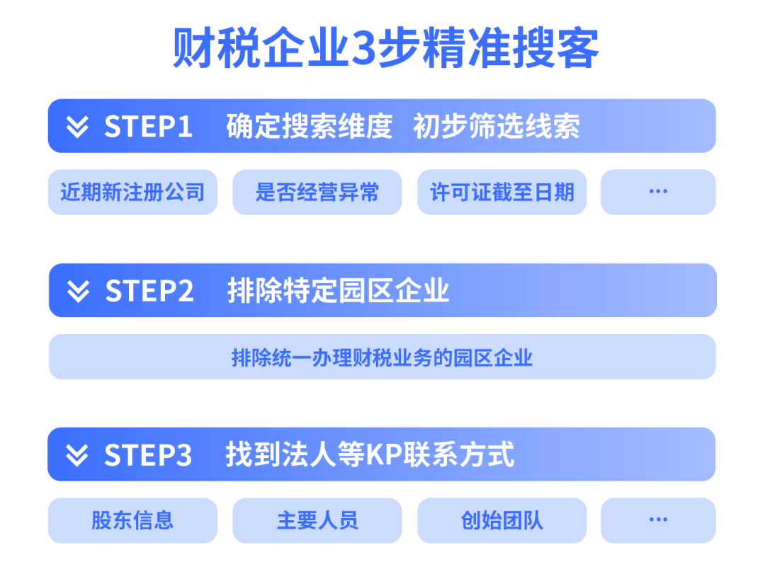 销氪认为,面对激烈的市场竞争环境,财税企业要向内建立标准化的销售管理体系和客户服务体系,扩大增量客户、开发存量客户,以公司内部经营数智化探索财税企业新的发展路径。对此销氪基于数百家财税企业的服务经验,推出财税行业销售解决方案:以财税中小企业的收益+效果为导向,销氪为企业提供大数据获客渠道,总结财税企业营销拓客3步法,从初步筛选、排除特定园区企业到锁定KP,建立财税行业特色化的获客方式;